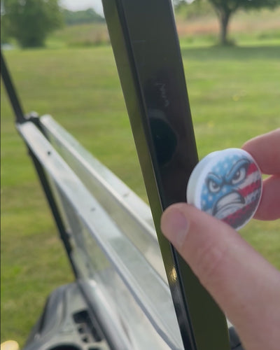 Contains a strong rare-earth magnet which attaches to the metal bars/posts on any golf cart. Also sticks to irons when you're carrying your clubs or when banging drivers during a large bucket therapy session on the range.